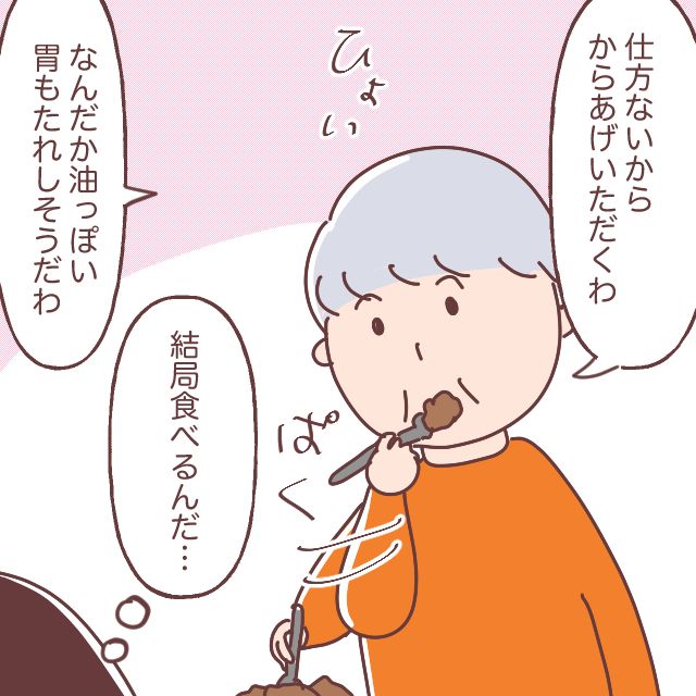 そして「仕方ないからからあげいただくわ」そう言ってひょいっとからあげを口に運びました。「なんだか油っぽい。胃もたれしそうだわ」そう言いながらもぱくぱく食べる義母を見て、「結局食べるんだ・・」と心の中で呟く私。