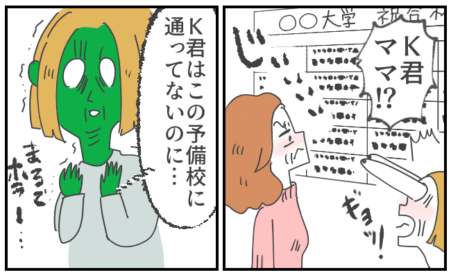 そんなとき、あるママ友から「同じ予備校に通っていないはずのK君のママが、保護者のふりをして無断で予備校に紛れ込み、掲示物で同級生がどの大学に合格したかを調べている」という話を聞いたのです。またK君ママと近しい別のママ友からは「K君ママが近隣の予備校や受験塾に片っ端から侵入しては、知っている子の進学先を調べ回っている」と聞きました。