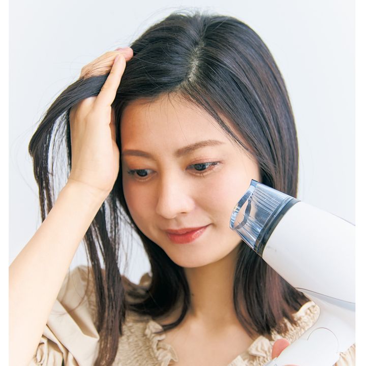 1.前髪を毛流れと逆に分け、手ぐしを通しながらハンドブローします。根元が潰れないように、下から風を当てるのがコツです。