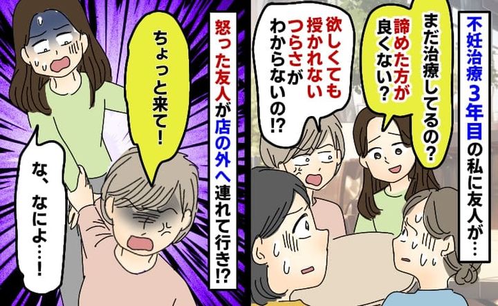 不妊治療3年目の私に子持ちの友人が「もう諦めたら?」すると別の友人が怒って店の外へ連れ出して!?