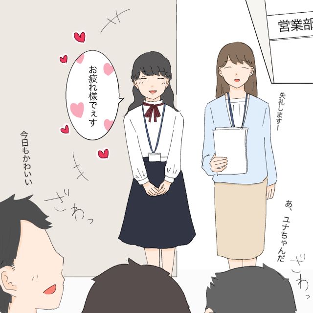 私と足立さんが営業部の部屋に入ると、営業部の男性社員たち数名が「あ、ユナちゃんだ」「今日もかわいい」などとざわめくのが聞こえました。足立さんはそんな男性社員たちに「お疲れ様でぇす」と甘い声で愛想を振りまいていました。