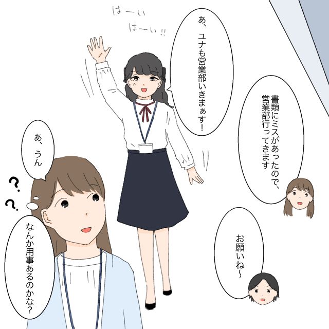 その後、業務に戻った私たち。処理していた書類にミスを見つけた私が「書類にミスがあったので、営業部に行ってきます」とともか先輩に伝えて営業部に行こうとすると、「あ、ユナも営業部いきまぁす!」と手を挙げながら足立さんが言いました。「なんか用事があるのかな?」と思った私は特に気にすることなく一緒に営業部へ行くことにしました。