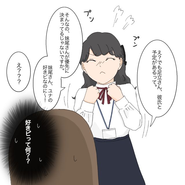 足立さんは彼氏とのデートの予定があるからと言って昨日の送別会を欠席していました。業務時間外の送別会に参加を強制するつもりはありませんでしたしそれは良いのですが、「村岡さんと妹尾さんが来るなら行きたかったのに。黙ってるなんてひどい」と私が責められるのは納得がいきません。「足立さん、彼氏と予定があるって言ってたじゃない」と言うと「そんなの、妹尾さんが優先に決まってるじゃないですか。妹尾さん、ユナの好きピなのに~!」とプンプン怒る足立さん。え???好きピって何??足立さんの言ってることが色々と分からない・・。