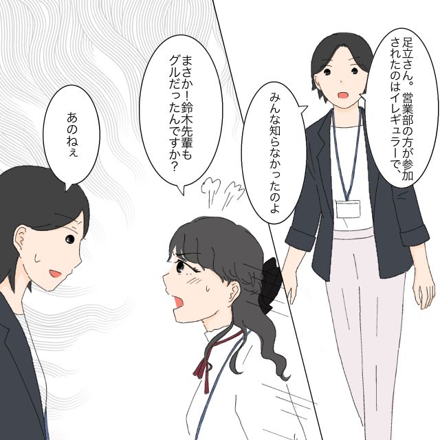 返答に困っていると、私たちの会話が聞こえたようでともか先輩が「足立さん。営業部の方が参加されたのはイレギュラーで、みんな知らなかったのよ」と事情を説明してくれたのですが、「まさか!鈴木先輩もグルだったんですか?」と今度は怒りの矛先をともか先輩に向ける足立さん。ともか先輩は足立さんのまさかの反応に「あのねぇ」と呆れています。