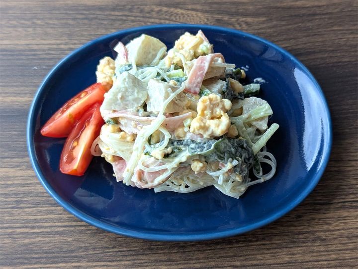 見た目は少しサラダっぽい仕上がりに。酢を半分に減らして、マヨネーズと白ゴマのコクを加えたことでマイルドになり、子どもや酸っぱいものが苦手な人でも食べやすい味になりましたよ。