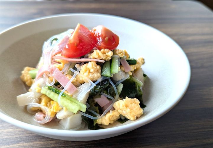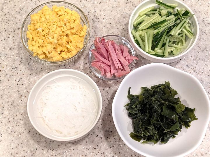 3.きゅうりとハムは細切り、わかめと春雨は湯で戻し、卵はスクランブルエッグにする。