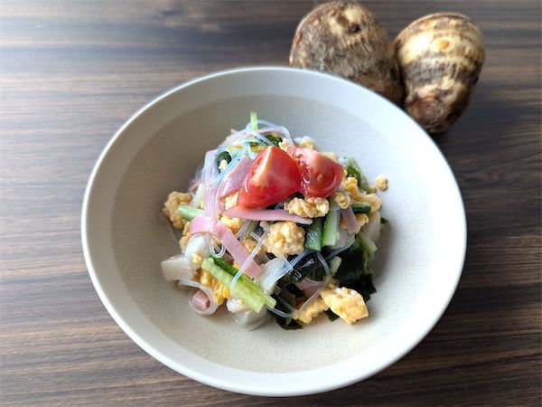 里芋のねっとりした食感に春雨、わかめ、きゅうりの異なる食感が加わり、噛むたびに変化があって楽しい!