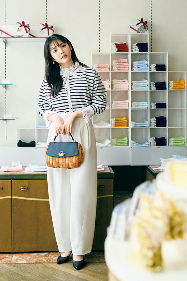 ボーダーニット¥20,900、パンツ¥22,000/ともにカデュネ バッグ¥27,500/ヴィオラドーロ(ピーチ) イヤリング¥3,300/ミミサンジュウサン、リング[人さし指]¥1,980/アネモネ(ともにサンポークリエイト)リング[中指]¥4,620/フル・オブ・グレイス(ズットホリック) パンプス¥18,150/ダイアナ(ダイアナ 銀座本店)写真2枚目のピンクハンカチ¥1,650、ブルーハンカチ¥1,430、イエローハンカチ¥1,760/以上近沢レース店