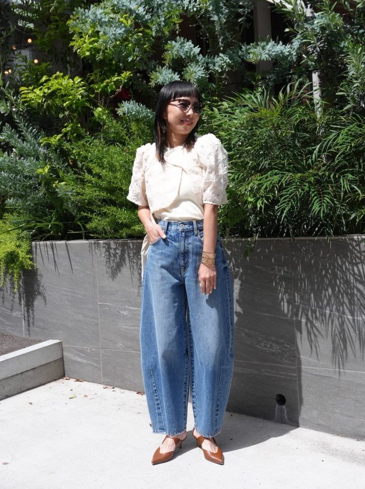 「ヴィンテージ感のあるレースのボレロとデニムの相性がよく、春らしい着こなしになるので気に入っています。コクーンシルエットのパンツはヘリンの定番で、脚長に見せながら体型もカバーしてくれるので人気のアイテム。さらにショート丈のボレロを合わせることでスタイルアップを狙いました」