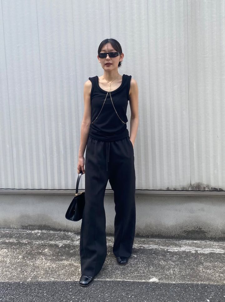 「華奢なベネチアンチェーンを使ったボディチェーンやリングなど、ゴールドのジュエリーが主役になるよう、他はブラックでまとめたコーディネートに。ボディーチェーンはタンクトップなどカジュアルなアイテムを上品に見せてくれるところがお気に入りです」