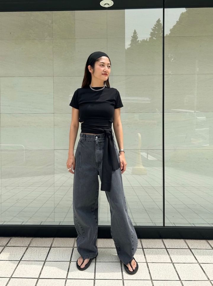 「オーガニックコットンを使用したバルーンシルエットのデニムパンツを主役に、私の定番スタイルでもあるオールブラックコーデにまとめました。ウォッシュのかかったブラックデニムや、少し肌見せ感のあるデザイントップスを合わせることで、シンプルながらもこなれた印象を意識。サンダルやターバンでヌケ感のあるリラックスムードに仕上げたのもポイントです」