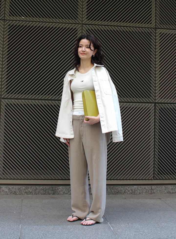 「両手につけているリングは全て6月に発売予定のアイテム。少し光沢があるシャツに白のゴムパンツをはき、ビーチサンダルを合わせたリラックススタイルにさり気なくジュエリーを合わせています。バックは小さめのものを選ぶことで、ラフになりすぎないようフォーマル感をプラスしています」