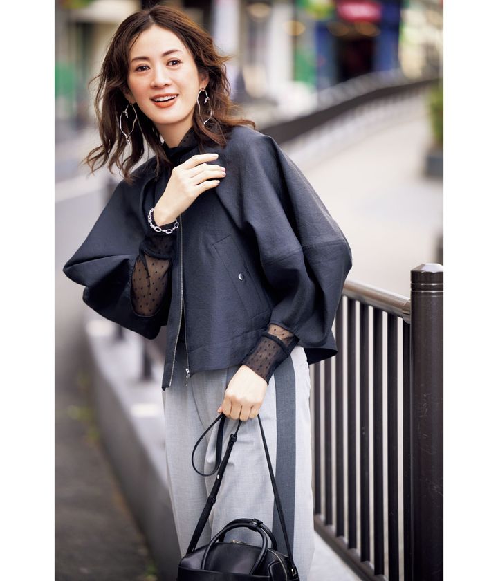 定番の黒羽織りもひねりの利いたデザインや素材に更新すれば一気に洗練。ボリューム袖が目を引く甘ブルゾンはシアートップスを覗かせシックに。カラーレスならドットが悪目立ちせず華やぎます。ラインパンツでさらに鮮度を上げて。