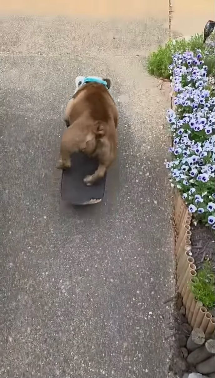 スケートボードで遊ぶのが大好きだというブルドッグ。 外に出ると、さっそくスケートボードで遊びたいと激しいアピールを始めました!