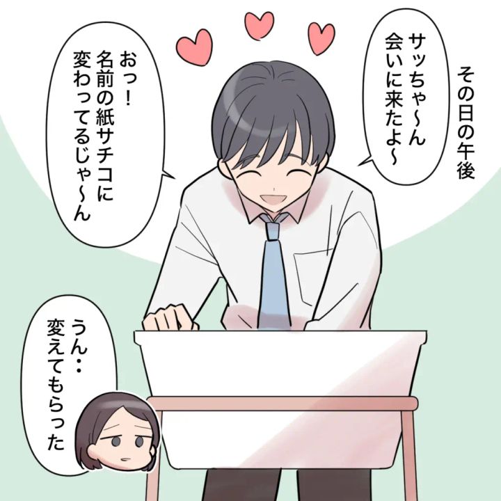 午後になって、ショウタが「サッちゃ~ん、会いに来たよ~」と嬉しそうにやってきました。娘の誕生を本当に嬉しそうにしてくれていて、本来ならショウタが会いに来てくれるこの時間はすごく楽しみな時間のはずなのに。「おっ!名前の紙、サチコに変わってるじゃ~ん」と嬉しそうに言われると、気持ちが沈んでしまいました。