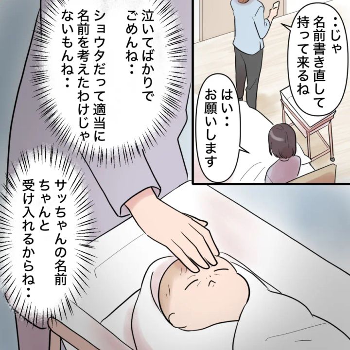 スヤスヤとよく眠るナナちゃん・・・いや、サッちゃんなんだよね。泣いてばかりでごめんね。そっと娘の頭に手を当てました。ショウタだって適当に名前を考えたわけじゃないもんね。サッちゃんの名前、ちゃんと受け入れるからね。一生懸命自分に言い聞かせていました。