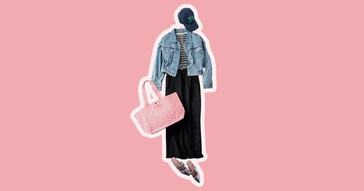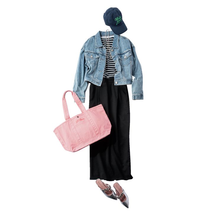 『CLASSY.』着回しDiaryから、おすすめコーデをピックアップ!ボーダーTと黒のロングスカートでキレイめモノトーンにまとめたら、スタイルアップ効果もある短丈のGジャンを羽織って程よくカジュアルダウン。キャップやトートバッグなどスポーティ要素をプラスすれば、今っぽバランスに仕上がります!