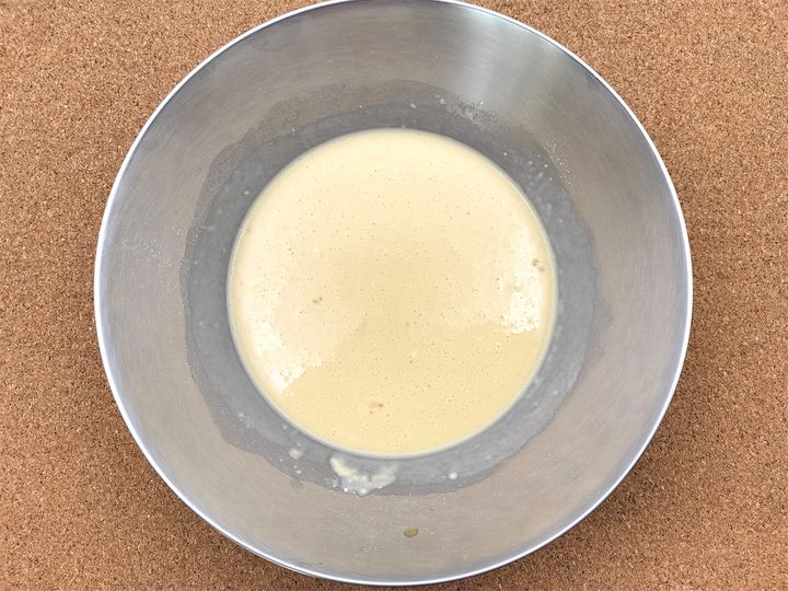 2. 水と卵を少しずつ入れ、叩くように混ぜます。