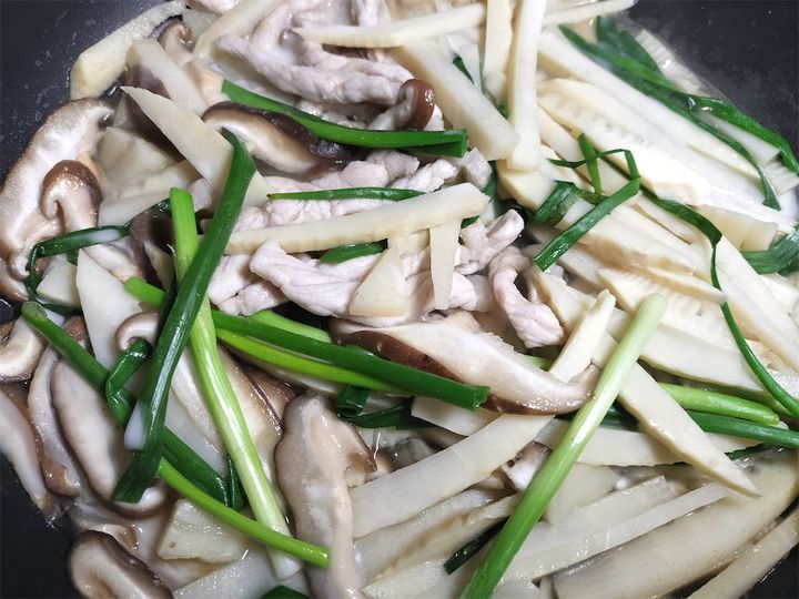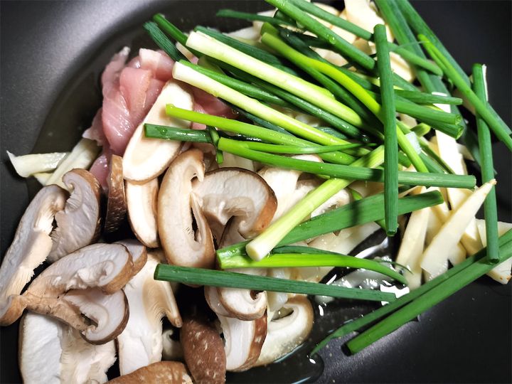 4. フライパンにたけのこ、豚肉、青ねぎ、しいたけ、だし汁を入れ、中火にかけます。