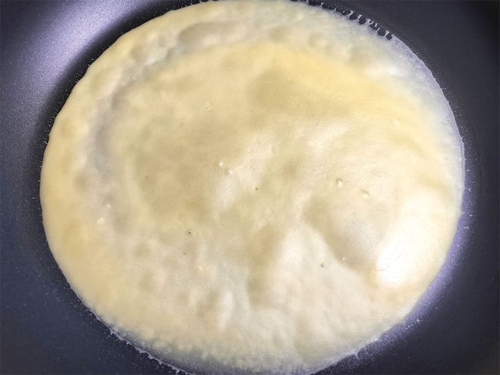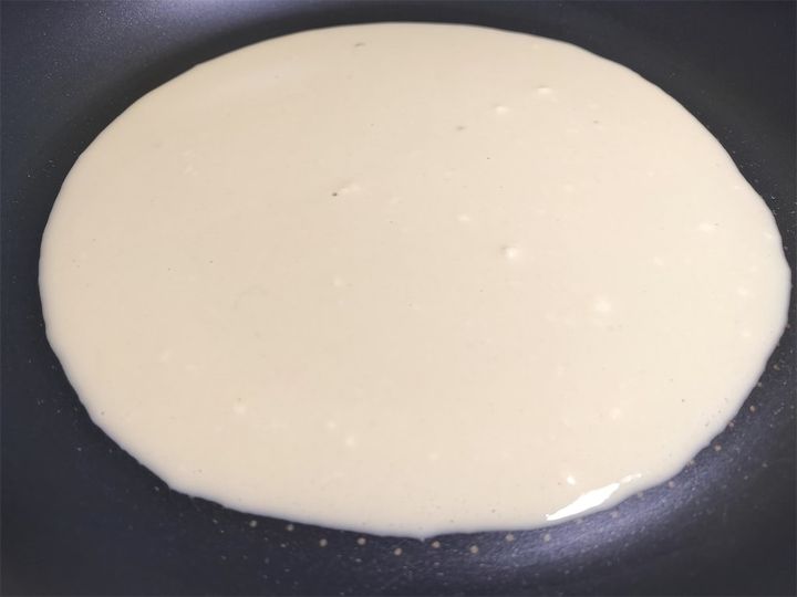 6. 別のフライパンに3を大さじ3入れ、フライパン全体に薄く伸ばします。