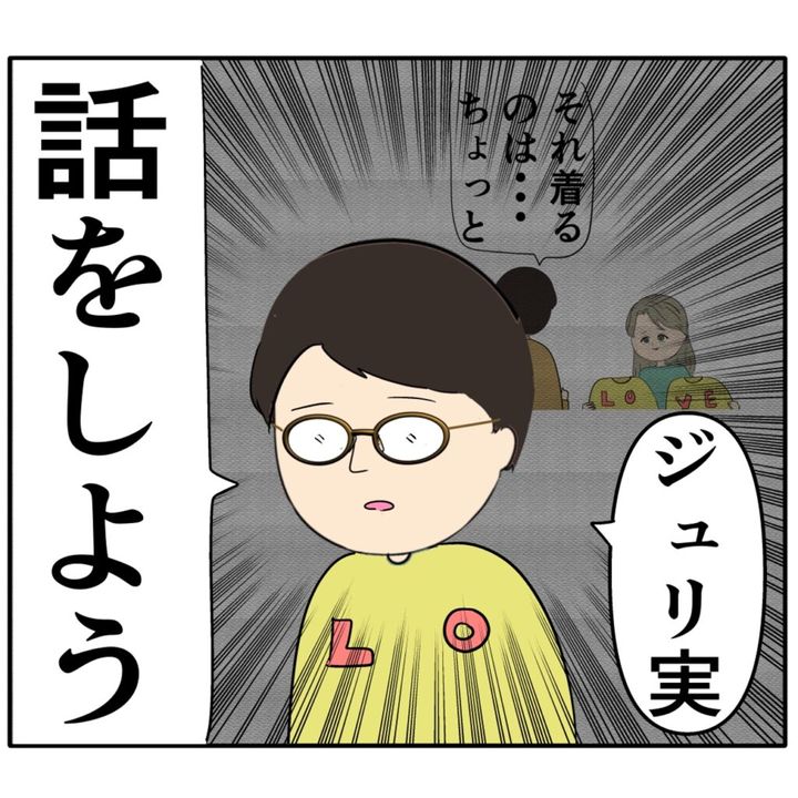 「ジュリ実、話しをしよう」とドア越しに声をかけためが根さんは、以前ジュリ実さんから提案され断ったペアルックの服を着ていました。