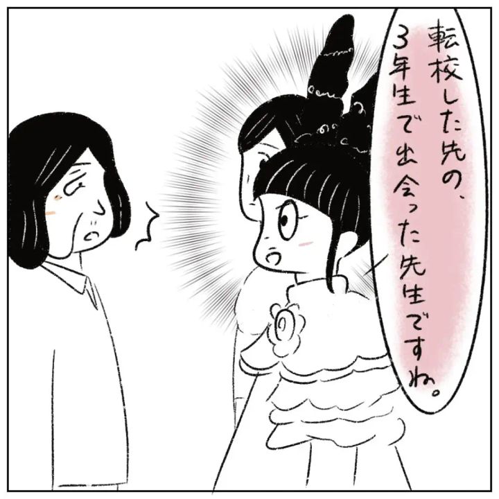 小学2年生のまるさんに酷いいじめをしておきながら、「私を恩師として紹介して」と平気でお願いする図々しい性根先生。さらに「今のあなたがあるのは、あえてあの時厳しくした私の指導の賜物なの!」と言って自分の行為を正当化するだけでなく恩まで売ってくるので、まるさんの怒りは爆発寸前。隣にいたヨーちゃんの「相手はモンスター。話、通じひんよ」という一言で冷静さを取り戻したまるさんが「私がもし有名になったとして、恩師として名前を挙げる先生は転校先の3年生で出会った先生ですね」と毅然とした態度できっぱり伝えると、性根先生は心底驚いて「えぇっっ!なんでよ!?」と頭を抱えました。