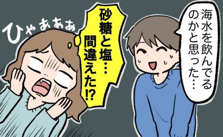 しかし……。「食べようと口に入れたら、海水飲んでいるのかなって思った(苦笑)」と言われ、私は一瞬で自分の過ちに気づきました。砂糖と塩を間違えていたのです! とんでもないことをしてしまった!と彼の言葉に衝撃でいっぱいで、彼には何度も謝ることに……(苦笑)。
