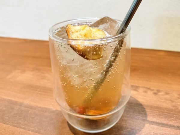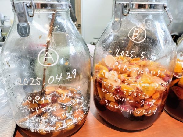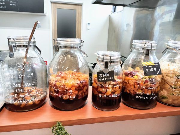 酵素シロップとは、季節の果物や野菜、ハーブなどにきび砂糖を加えて発酵させたもの。 カウンターには発酵中の酵素シロップの瓶がずらりと並んでいます。 この中から好きな酵素シロップを選んで、炭酸で割ったドリンクに仕立ててもらいます。