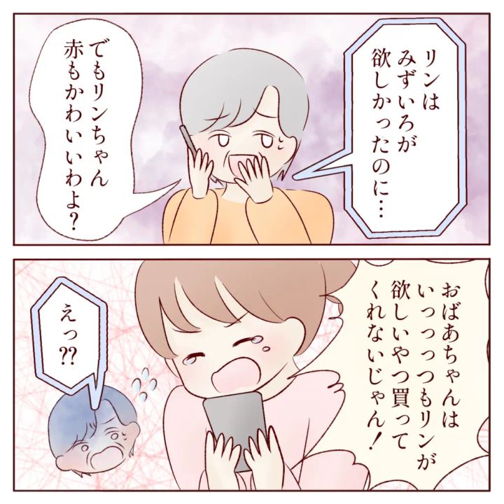 「リンはみずいろが欲しかったのに・・」リンちゃんがそう言うと、「でもリンちゃん、赤もかわいいわよ?」と義母。その言葉に、「おばあちゃんは、いっつもリンが欲しいやつ買ってくれないじゃん!」と涙ぐみながら言い、「えっ??」と義母はビックリ!