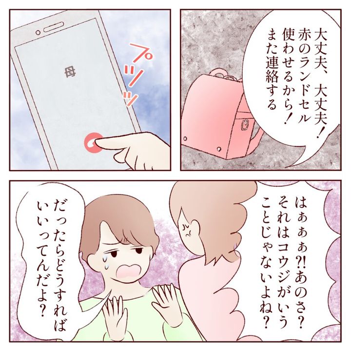 すると、「大丈夫、大丈夫!赤のランドセル使わせるから!また連絡する」そう言って義母との電話を切ったコウジに、「はぁぁぁ!?あのさ?それはコウジがいうことじゃないよね?」怒りながら、「だったらどうすればいいんだよ?」とコウジが言い返しました。