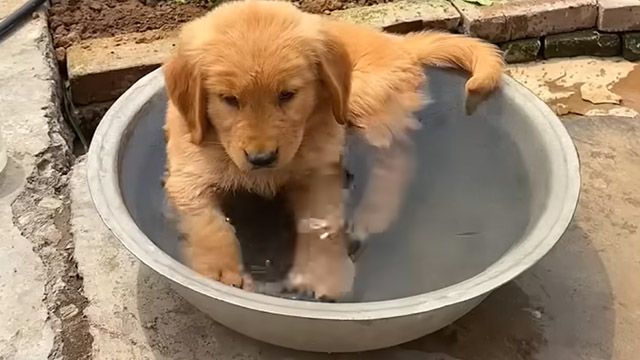 3. 小さなプールに大はしゃぎする子犬さん! でもそこには金魚さんも?