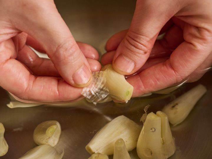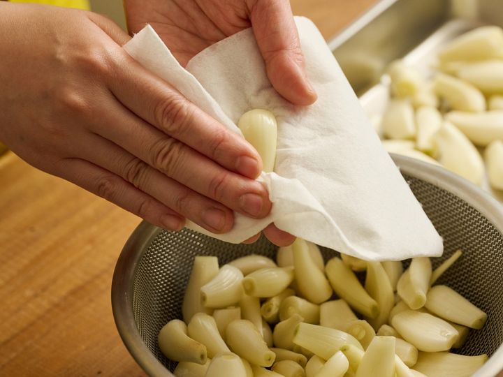 (3)水で洗い流しながら、つるんときれいならっきょうの部分が出てくるまで薄皮をむく。