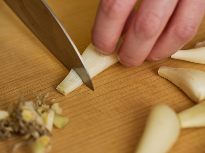(2)らっきょうの根元と先端を切り落とす。根元はつけ根ぎりぎりのところで、先端はふくらみが終わるくびれのあたりで切り落として。
