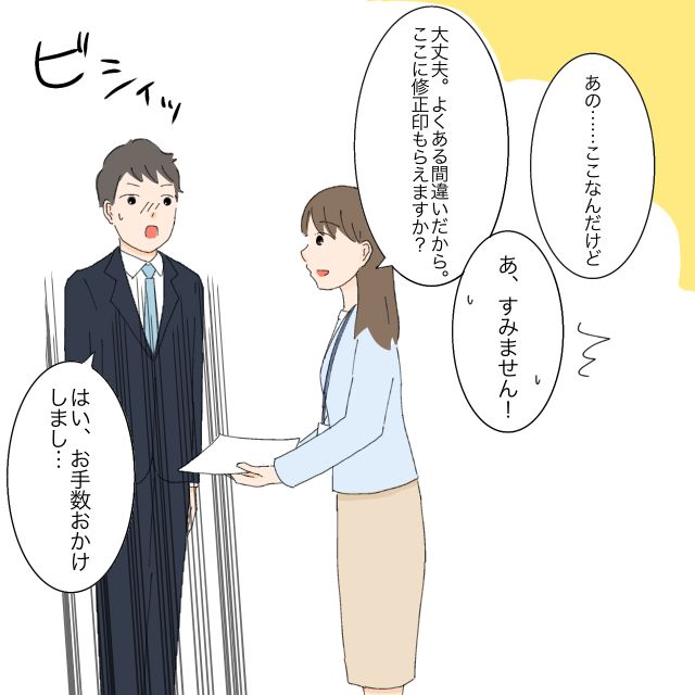 「あの・・ここなんだけど」と書類を差し出すと、「あ、すみません!」と慌てて謝られ、「大丈夫。よくある間違いだから。ここに修正印もらえますか?」と伝えると、「はい、お手数おかけし・・」ビシッと直立不動の姿勢で言う田中さん。