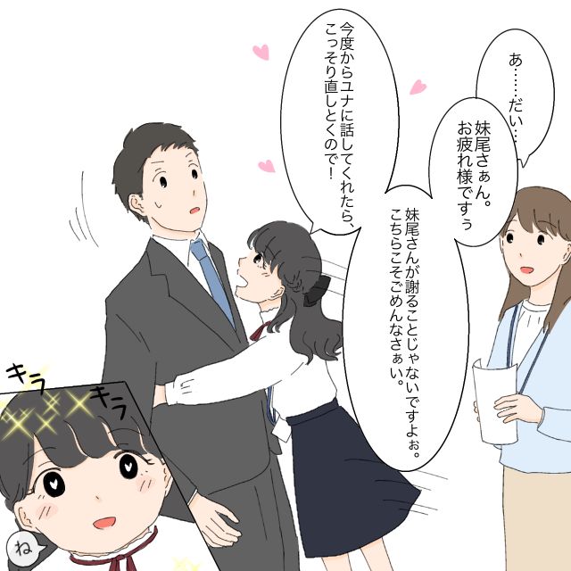 その後、書類にミスがあったため営業部に行こうとすると、「ユナも営業部行きまぁす」と手をあげ足立さんが一緒についてきたのですが、用事があるのかと思いきや、営業部に着くなりすぐに愛想を振りまきはじめたのでした。