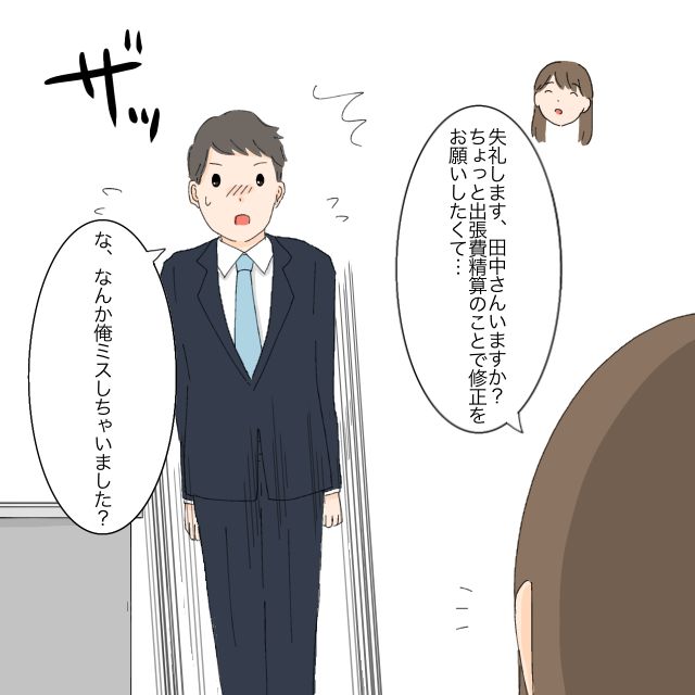 「失礼します。田中さんいますか?ちょっと出張費精算のことで修正をお願いしたくて・・」と声をかけると、「な、なんか俺ミスしちゃいました?」と慌てて立ち上がった田中さんに、