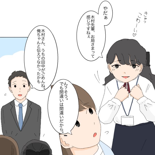 すると、「きゃっこわーい!やだぁ木村先輩、お局さまって感じですねぇ」足立さんにそう言われ、「ん?そう。でも間違いは間違いだから」と答えると、「木村さん、うちの田中がごめんね。俺ちゃんと伝えてなかったかも」そう言ってあらわれたのは、