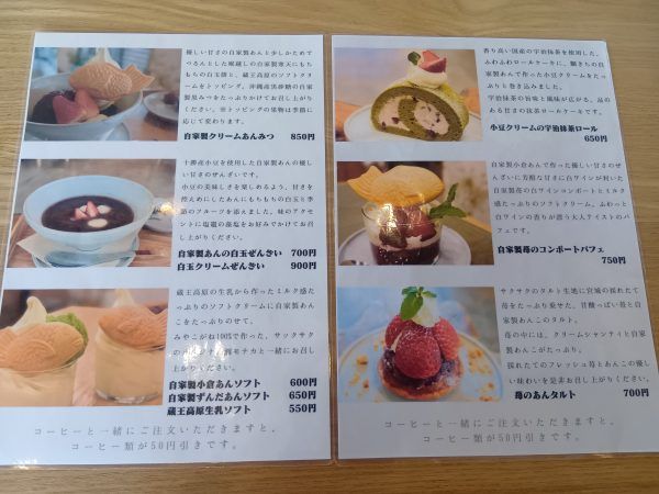 「自家製クリームあんみつ」や「自家製小豆あんソフト」「苺のあんタルト」「小豆クリームの宇治抹茶ロール」など。