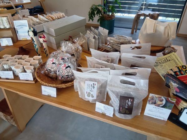 入口のお土産コーナーには「まころん」や「竃炊キ藻塩」「鯛あんモナカ」などがありました。
