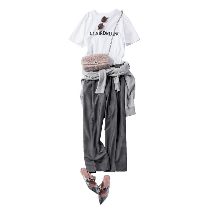 4.Tシャツ¥12,100(カデュネ/カデュネ プレスルーム)フーディ¥3,990(UNIQLO)バッグ¥79,200(アンテプリマ/ワイヤーバッグ/アンテプリマジャパン)シューズ¥47,300(プリティ・バレリーナ/F.E.N.)サングラス¥28,050(レイバン/ルックスオティカジャパン カスタマーサービス)ワイドパンツ着回し