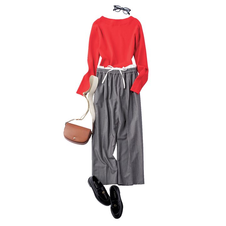 2.リブニット¥22,000(マルモア/DMC)バッグ¥79,200(ロンシャン/ロンシャン・ジャパン)ローファー¥19,800(ダイアナ/ダイアナ 銀座本店)めがね¥49,500(モスコット/モスコット トウキョウ)ワイドパンツ着回し