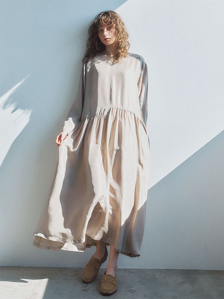 ドレスのような華やかさとリラクシーなゆるみをあわせもった流れるような落ち感のあるワンピース。気楽なだけ、華やかなだけには終わらない、ラクもキレイも体現できる1枚。