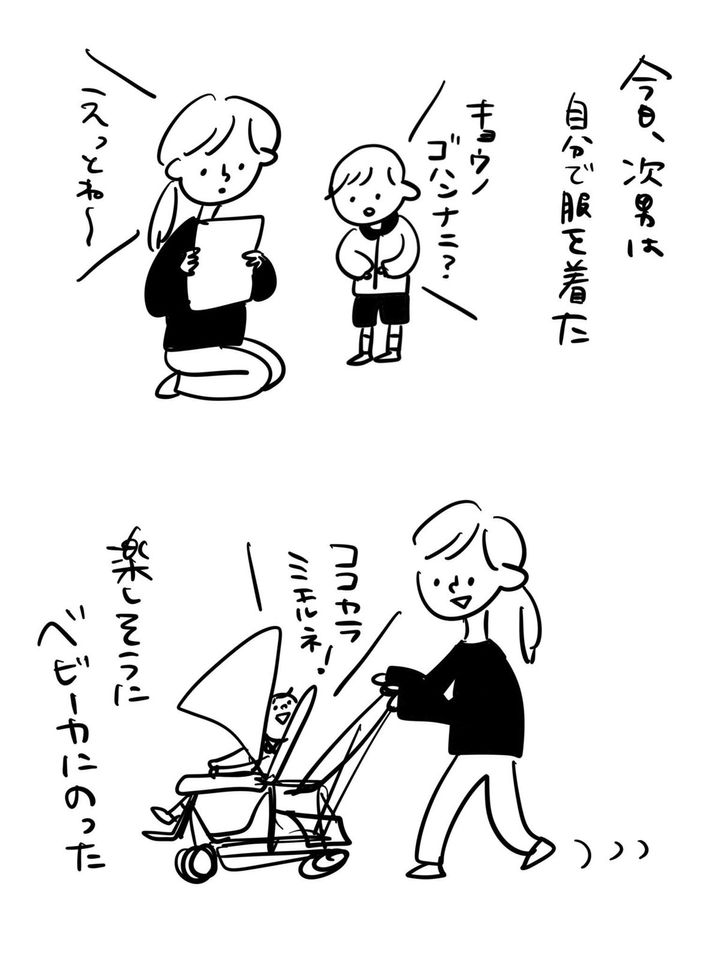 むぴー(@mupyyyyy)さんが描いたのは、次男くんの成長を感じたある日の出来事。嬉しさと寂しさが詰まった『今日という日』と題されたイラストがこちらです。