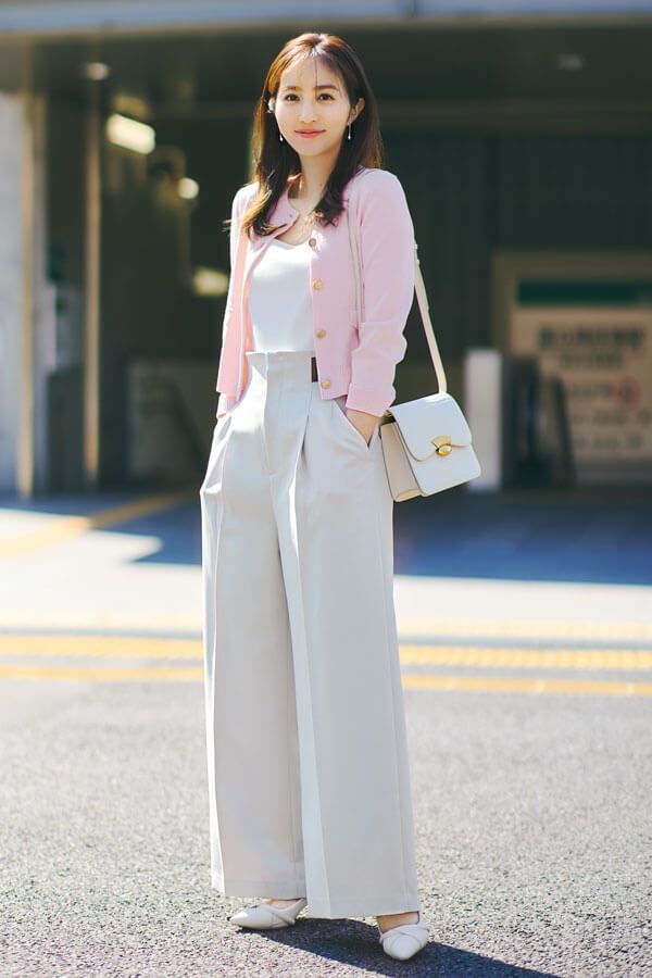 マニッシュ服をスパイスとして投入すれば、糖度は大幅減。甘ピンクをキレよく着こなせます。白系のワイドパンツならクリーンな美人感も♡ ミルキーな甘さのピンクカーデを、×ワイドパンツでカッコよく。コーデの白の分量を増やすのも、糖分セーブに有効。