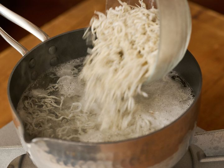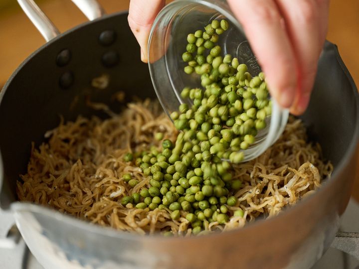 (1)鍋に湯を沸かしてちりめんじゃこを入れ、1分ほどゆでて水けをきる。