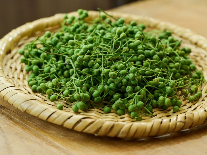 小さな粒にしびれるような辛みと爽やかな香りを秘めた実山椒。青々とした房は、山椒の実が熟す前の初夏限定の姿です。