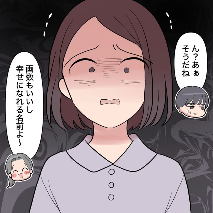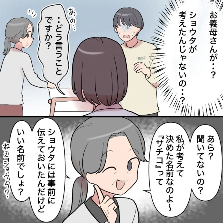 明らかに動揺して、「ん?あぁそうだね」と言葉を濁し、目をそらすショウタ。義母は「画数もいいし、幸せになれる名前よ~」と自信満々です。