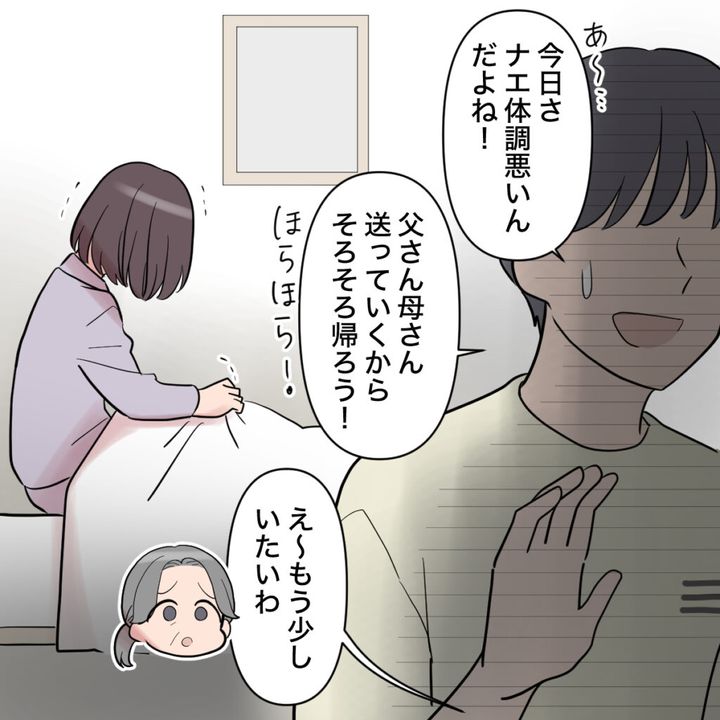 ショウタが急に「今日さ、ナエ体調悪いんだよね!」と言い出しました。そんなことお構いなしだったくせに。「え~もう少しいたいわ」とごねる義母を「父さん母さん、送って行くからそろそろ帰ろう!」と強引に連れて出ました。長居はしないって言っていたのも嘘じゃん。なにもかもウソじゃん!!