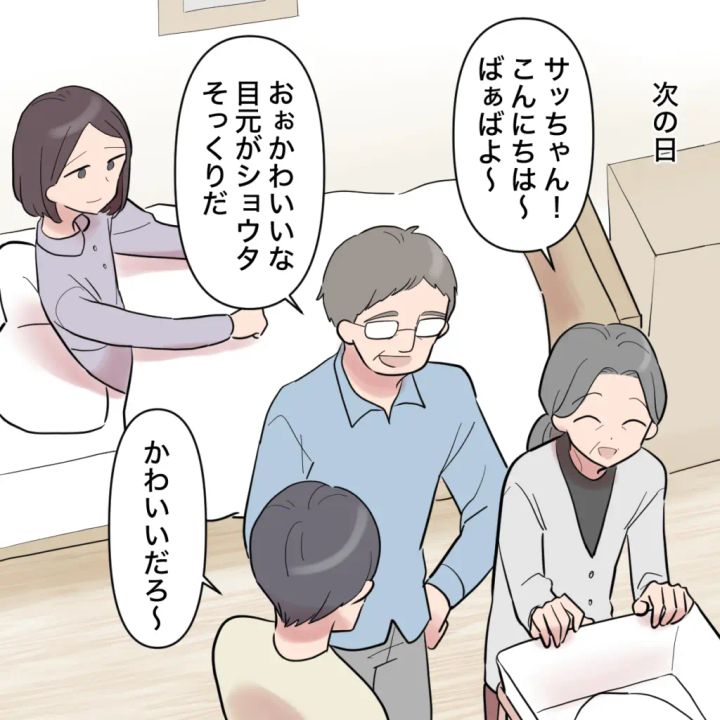 それでも、サッちゃんに会いに来た義父母がとても嬉しそうに「かわいいなぁ」「目元がショウタそっくりだ」などと口々に目を細めて言うと、「かわいいだろ~」と自慢げに返すショウタのやり取りを微笑ましく眺めていました。義母の衝撃的な発言を聞くまでは。