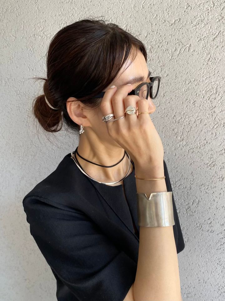 「一番のポイントは右手に持たせ、MAYUの『Layer』シグネットリングと細いリングが重なった印象的な2連リングを中心に、ダブルフィンガーリングと自作の幅広のバングルを合わせ、細~太までのさまざまなラインで手元をスタイリング。先端がSilver925になっている黒のコードネックレスは、巻き方次第でロングペンダントや、ループタイ風にできたりと、あらゆるコーディネートを楽しめるので、ほぼ毎日つけているほどお気に入りです。今回は左手のエルメスのダブルバンドとリンクさせています!」